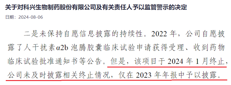 更值得注意的是研发项目的“取舍”。在2024年内,科兴制药先后终止了“人干扰素α2b泡腾胶囊”与“人干扰素α2b喷雾剂”的研发转化,意味着此前累计投入的约4800万元的研发资金直接损失。其中,科兴制药还因未能及时披露人干扰素α2b泡腾胶囊项目终止的信息,导致公司董事长及多名董监高因此收到了监管警示函。